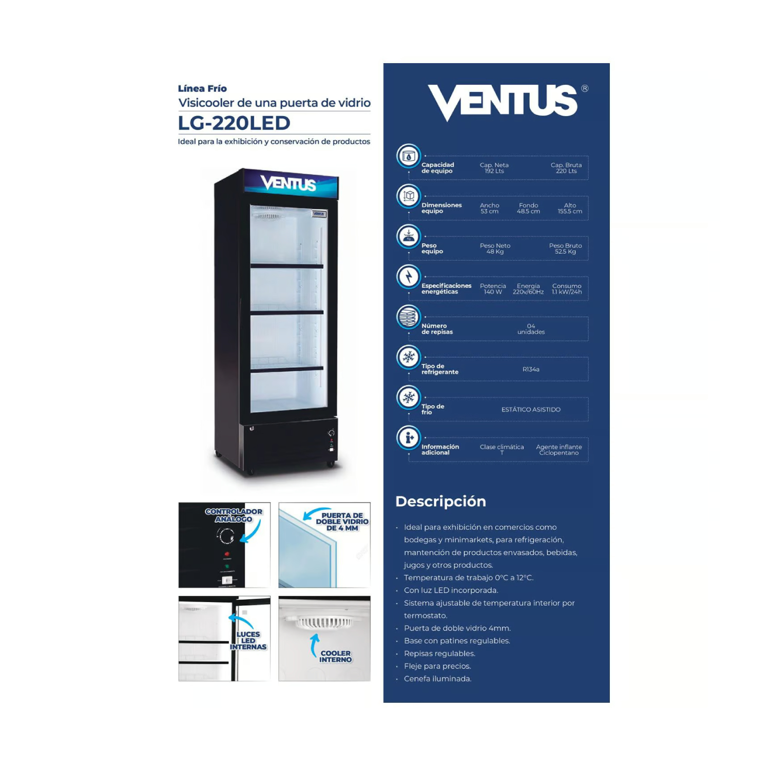 VISICOOLER 1 PTA DE VIDRIO 220LT VENTUS LG-220 LED